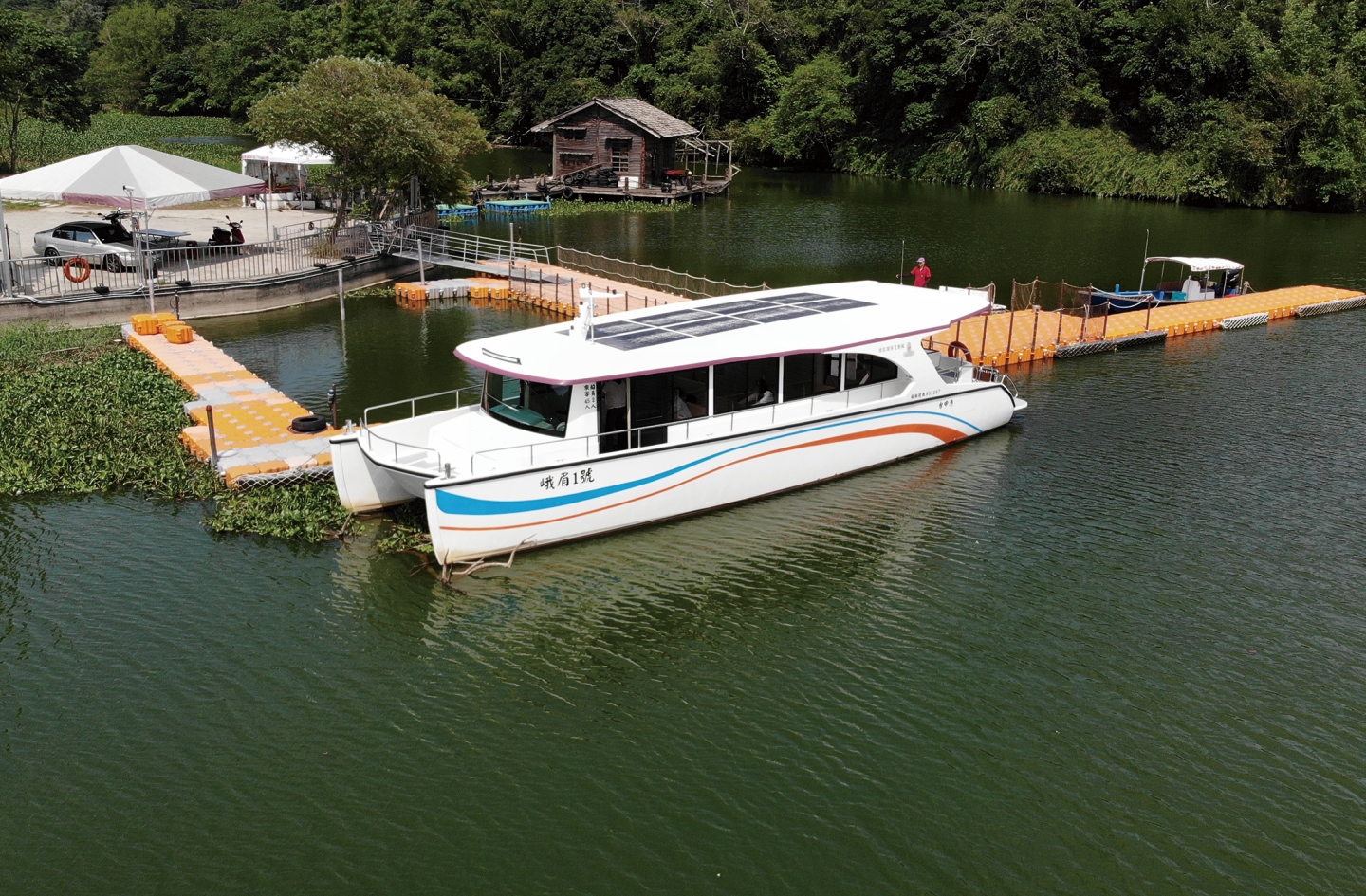 峨眉鄉公所打造峨眉湖水上觀光廊道,引進太陽能加電池作為動力來源的綠能遊艇,含遊客及船組人員可滿載