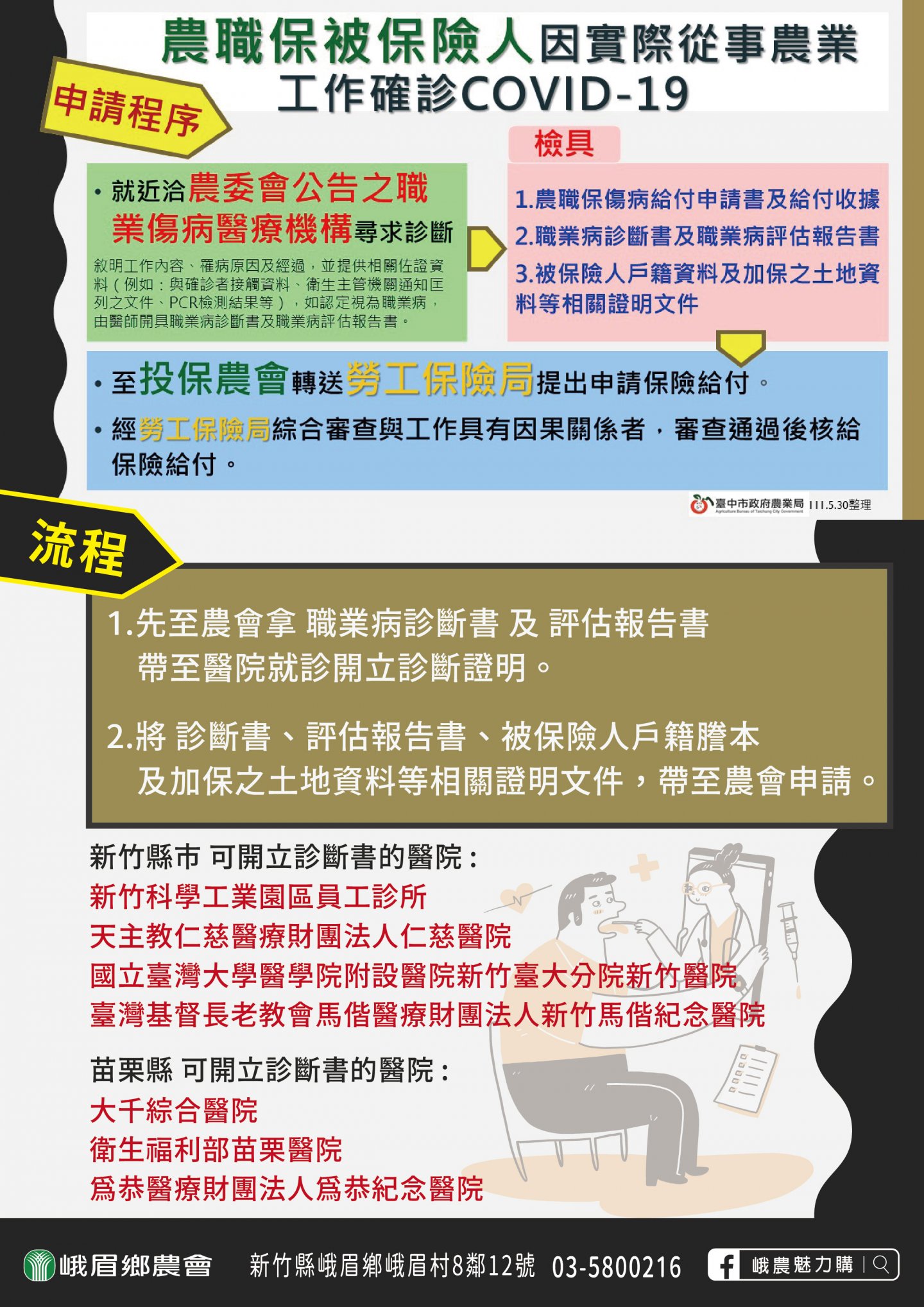 1.先至農會拿 職業病診斷書 及 評估報告書,帶至醫院就診開立診斷證明。
