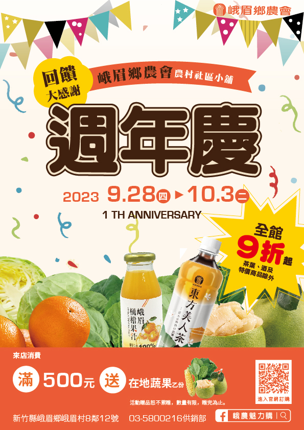 峨眉鄉農會農村社區小舖為歡慶開幕滿一周年,於09/28(四)至10/03(二)推出多重好康周年慶活動。