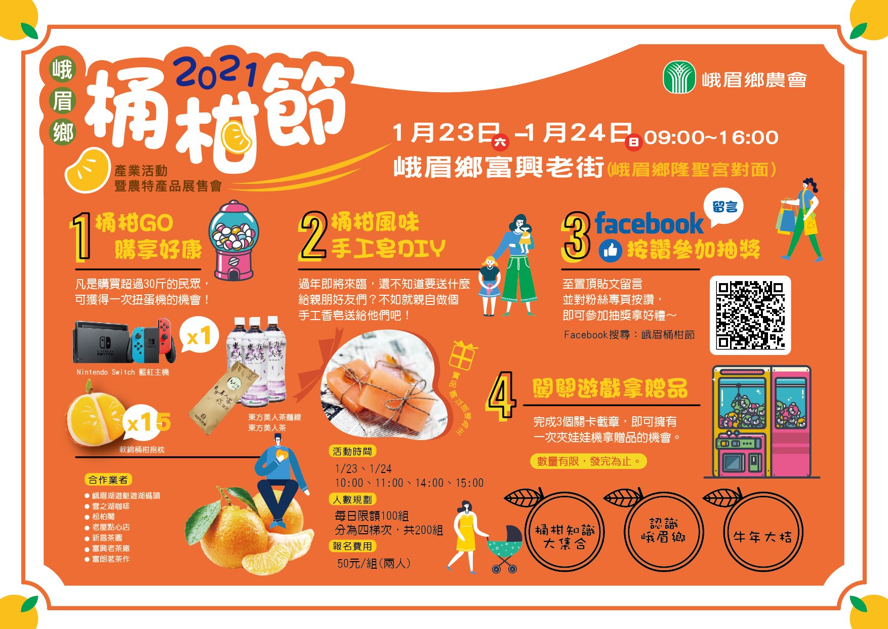 2021年峨眉桶柑節將於1月23日本週六上午十時開幕,活動中邀請行政院農業委員各級長官、新竹縣楊縣長文科、新竹縣議會張議長鎮榮等各級民代,現場的與會貴賓,前來揭開精彩序幕,活動兩日除了有一系列的精彩活動,現場還有葛樂堡樂團、新竹客家舞蹈團及峨眉鄉在地表演豐富的舞台節目演出,除此之外,為期兩天的活動內容還有「來闖關,拿贈品」、「桶柑手工香皂DIY」、「粉絲團貼文按讚留言週週送」等豐富的活動,等著民眾一起來同樂!活動詳情可參見峨眉鄉農會官網、FB「峨農魅力購」及「峨眉桶柑節」臉書粉絲及專頁。