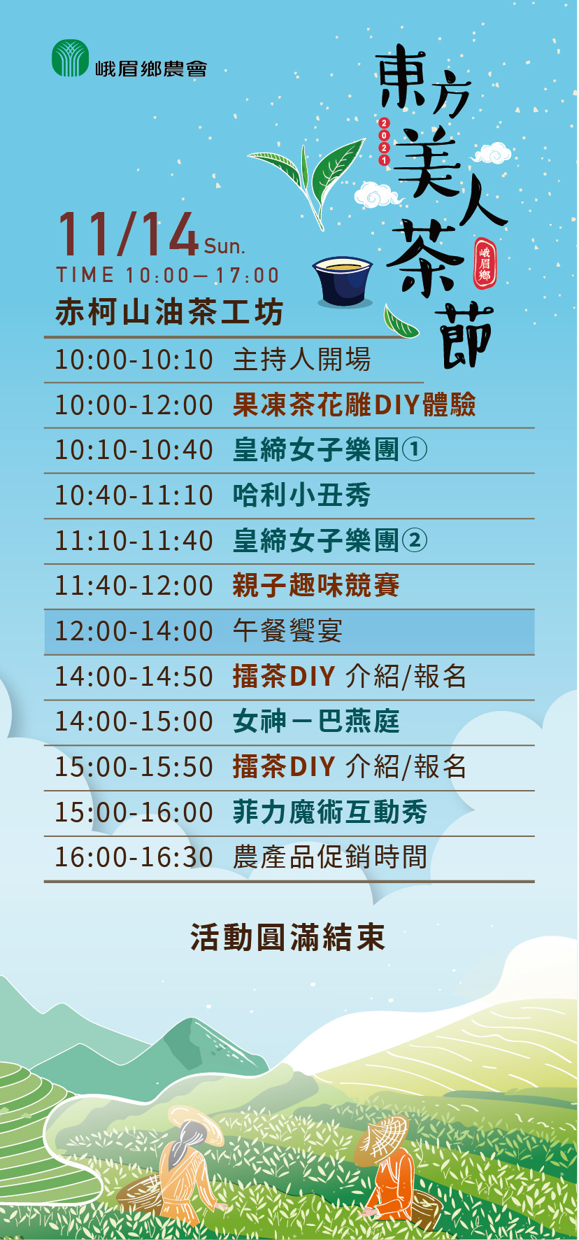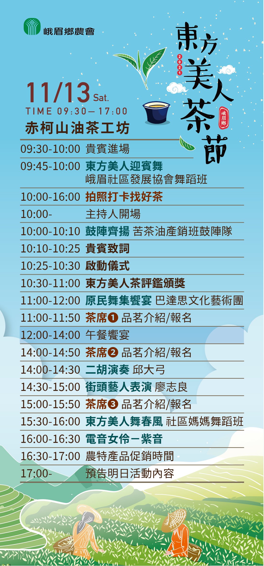 峨眉鄉公所及峨眉鄉農會也將於今年11/13~11/14兩日在「峨眉鄉赤柯山油茶工坊」舉辦「2021年峨眉鄉東方美人茶節產業活動暨農特產品展售會」